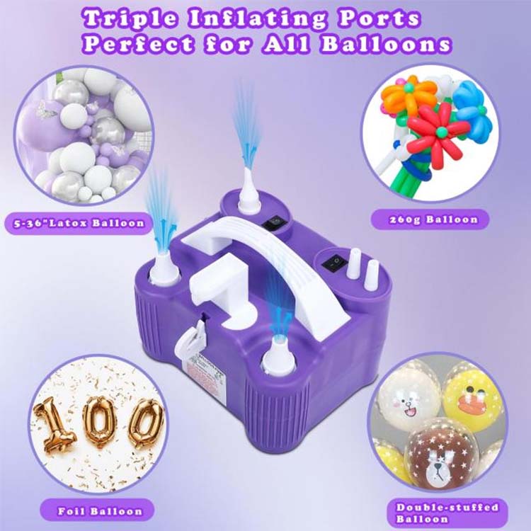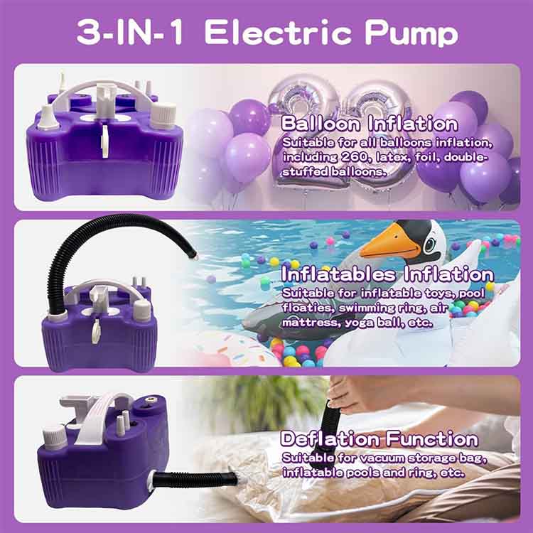Nově upgradované čerpadlo z Newshine® New Electric Balloon Pumpy má trojitý profesionální systém balónků: 2 kulaté latexové balónové trysky přesně se hodí 5-36 palcových standardních latexových balónků, což je usnadňuje použití pro vše od barevných balónkových stěn na narozeninové večírky až po romantické řetězce balónů na svatbě; 1 Rozšířená profesionální balónová tryska nafoukne hliníkové a kovové filmové balónky, praskající balóny, nafukovací balónky s dvojitým vrstvami a magické balóny 260Q/360Q, což umožňuje kreativní zvraty a tvary, jako jsou balóny zvířat, květinové dekorace a další výtvory pro kutily. Jedno čerpadlo zpracovává všechny typy balónů.