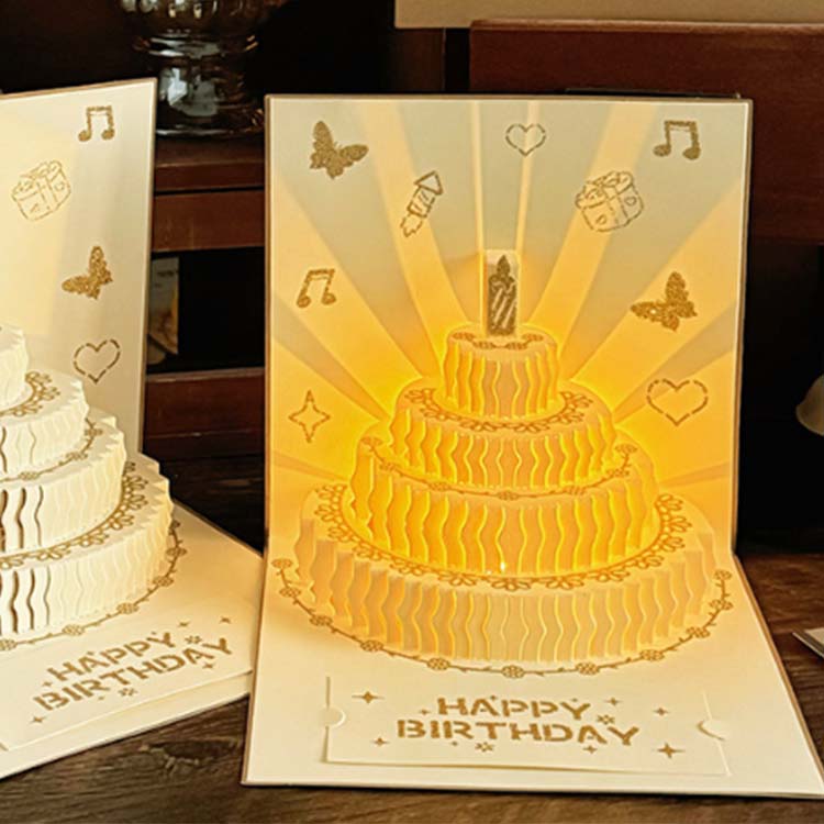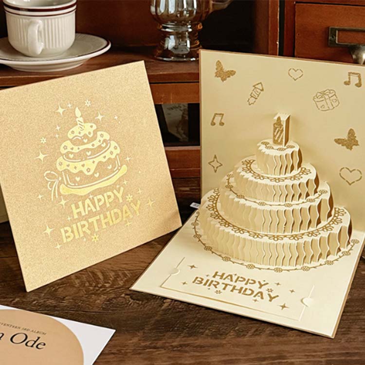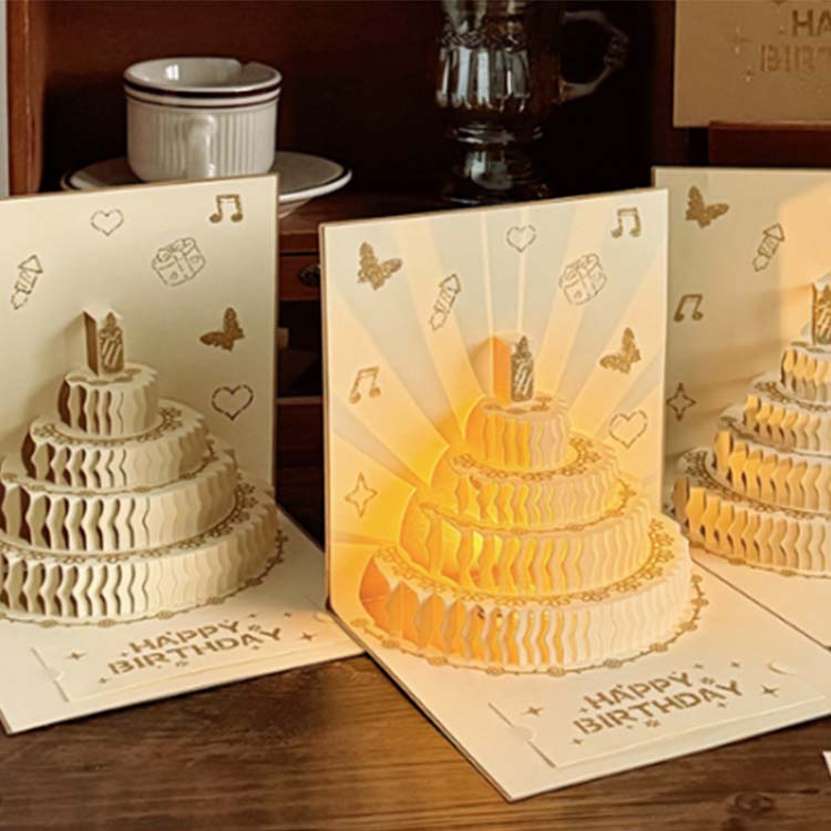 Obal 3D narozeninové karty je vyroben s barevným reliéfním procesem. Jeho interiér má design čtyřvrstvého dortu a pro blahopsanou zprávu je přidána malá pohlednice.