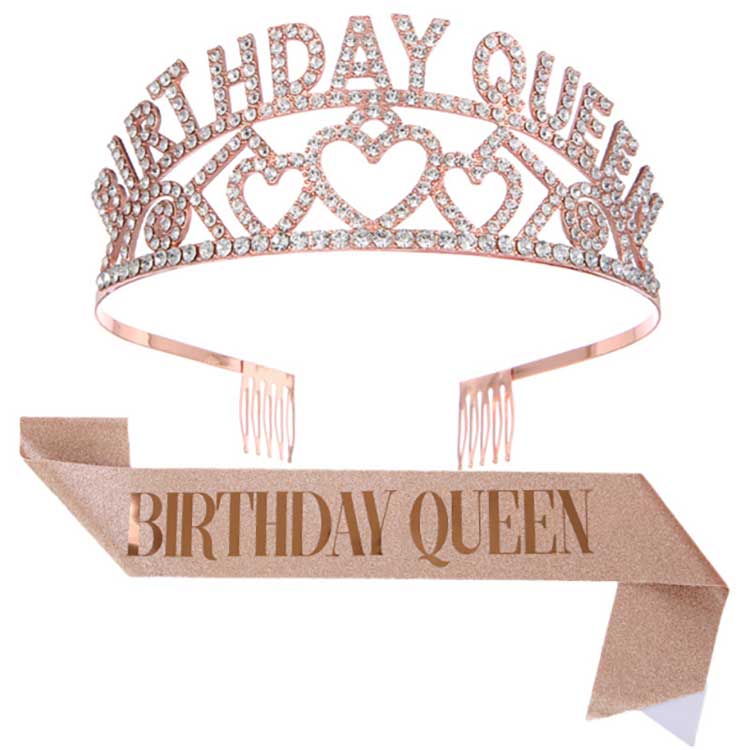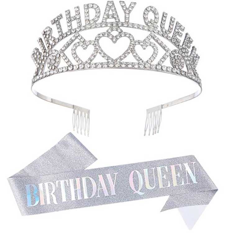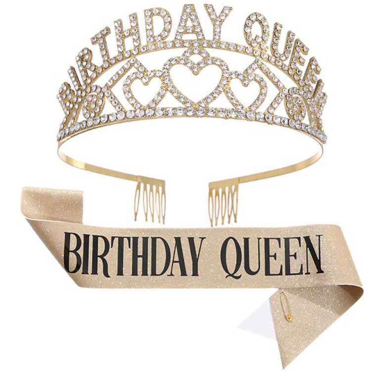 Birthday Queen Crown je čelenka, která se dodává jako sada s ramenním popruhem. Hlavní tělo korunky je vyrobeno ze slitiny, což zajišťuje, že nevybledne ani se nepoškodí. Použili jsme techniku intarzie, abychom diamanty zajistili ke slitinovému rámu a zabránili jejich snadnému vypadnutí. Tato perfektní kvalita produktu zaručuje, že jej můžete i nadále používat při budoucích narozeninových událostech.
