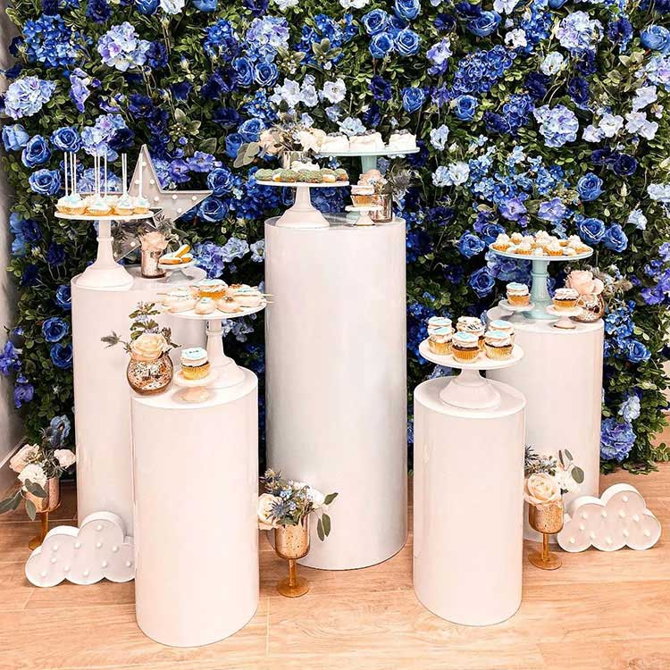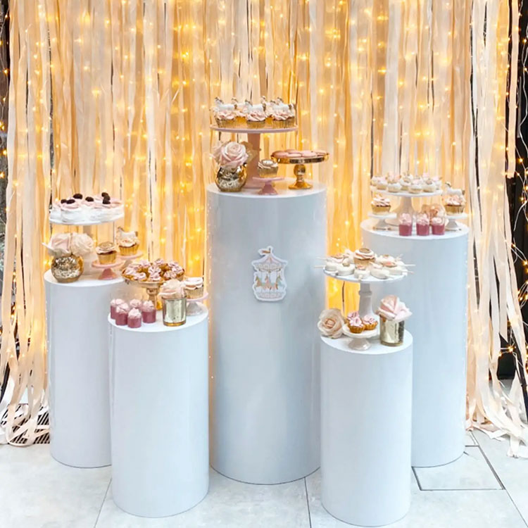 Dezertní stolek s válcovou podnoží slouží jako nádoba i jako ozdoba. Obvykle se dodávají v různých kombinacích: 3dílné kombinace, 5dílné kombinace, 7dílné kombinace a tak dále. Nejčastější kombinací je pět kusů. Nezávislé válcové tubusy různých velikostí lze flexibilně uspořádat a jsou důležitou součástí scény. Zároveň nabízíme také přizpůsobení velikosti a tvaru. Navíc se hodí k vaší party dekorace.