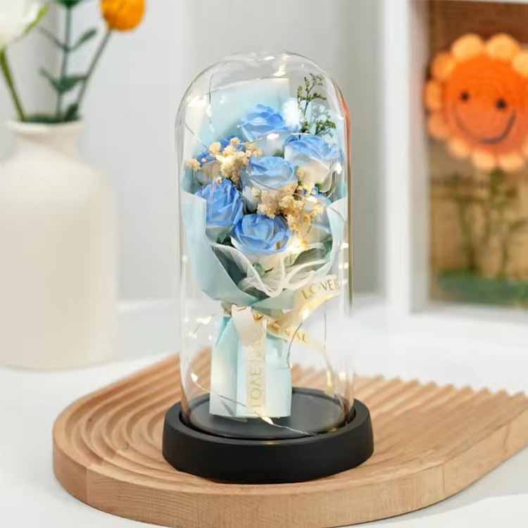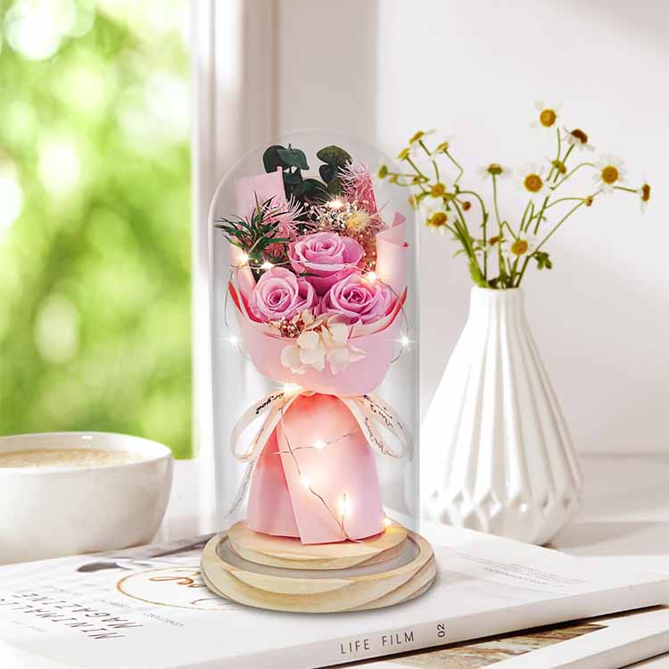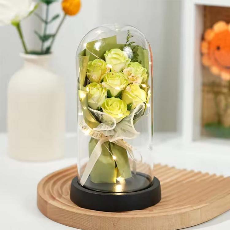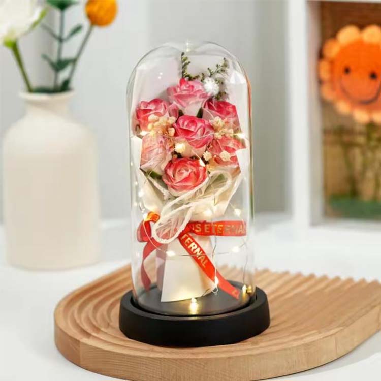 Kytice mýdlových růží ze skleněné kupole s LED se používá v kombinaci s mýdlovými květy a konzervovanými květinami. LED světla využívají teplé a neoslnivé světlo, které může dodat hřejivou atmosféru při zdobení scén. Vestavěný LED světelný řetězec má také barevná blikající světla a barvy lze upravit tak, aby vyhovovaly vašim potřebám. Tuto kytici se skleněným krytem lze použít k nastavení scén, jako jsou narozeniny, výročí, návrhy, návrhy atd. dárek.Věčné květiny neuvadnou a nezmění barvu ani se skleněným obalem. Mýdlové květy lze také použít k mytí rukou nebo jako vůni. Tato kytice růží je ekonomická a praktická.