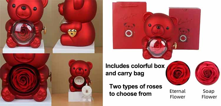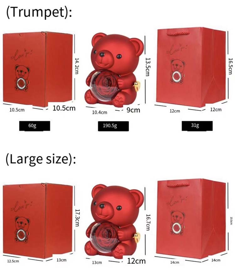 Zachovaný květinový medvídek s překvapením se dodává ve dvou velikostech: velké a malé. Velikost si můžete vybrat podle svých potřeb! Jedna věc, kterou je třeba poznamenat, je, že náhrdelník a prsten na obrázku jsou rekvizity pro focení. Dvě velikosti mají své vlastní vlastnosti, které umožňují každé emoci najít ten správný způsob, jak jej nosit.