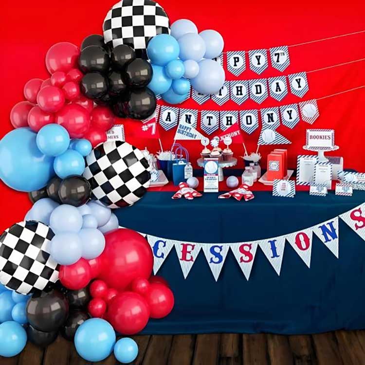 Dekorační sada balónového oblouku se závodním motivem je dekorativní řešení speciálně navržené pro večírky, události a narozeninové oslavy se závodní tématikou. Tento produkt je zaměřen na téma automobilových závodů. Přidáním černých, stříbrných, modrých a červených latexových balónků, stejně jako modelů aut a závodních doplňků, dosahuje konečného výsledku formování tvaru oblouku jako dekorace, čímž vytváří vášnivou a veselou atmosféru místa akce.